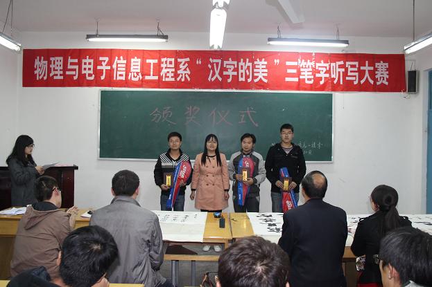 本次比赛分毛笔、粉笔、钢笔三种形式。从10月22日开始的各班初赛参加人数257人到复赛时的139人,直至10月30日进入决赛的毛笔组9人、钢笔组9人、粉笔组9人,物理与电子信息工程系共计270人参与到这个活动中。