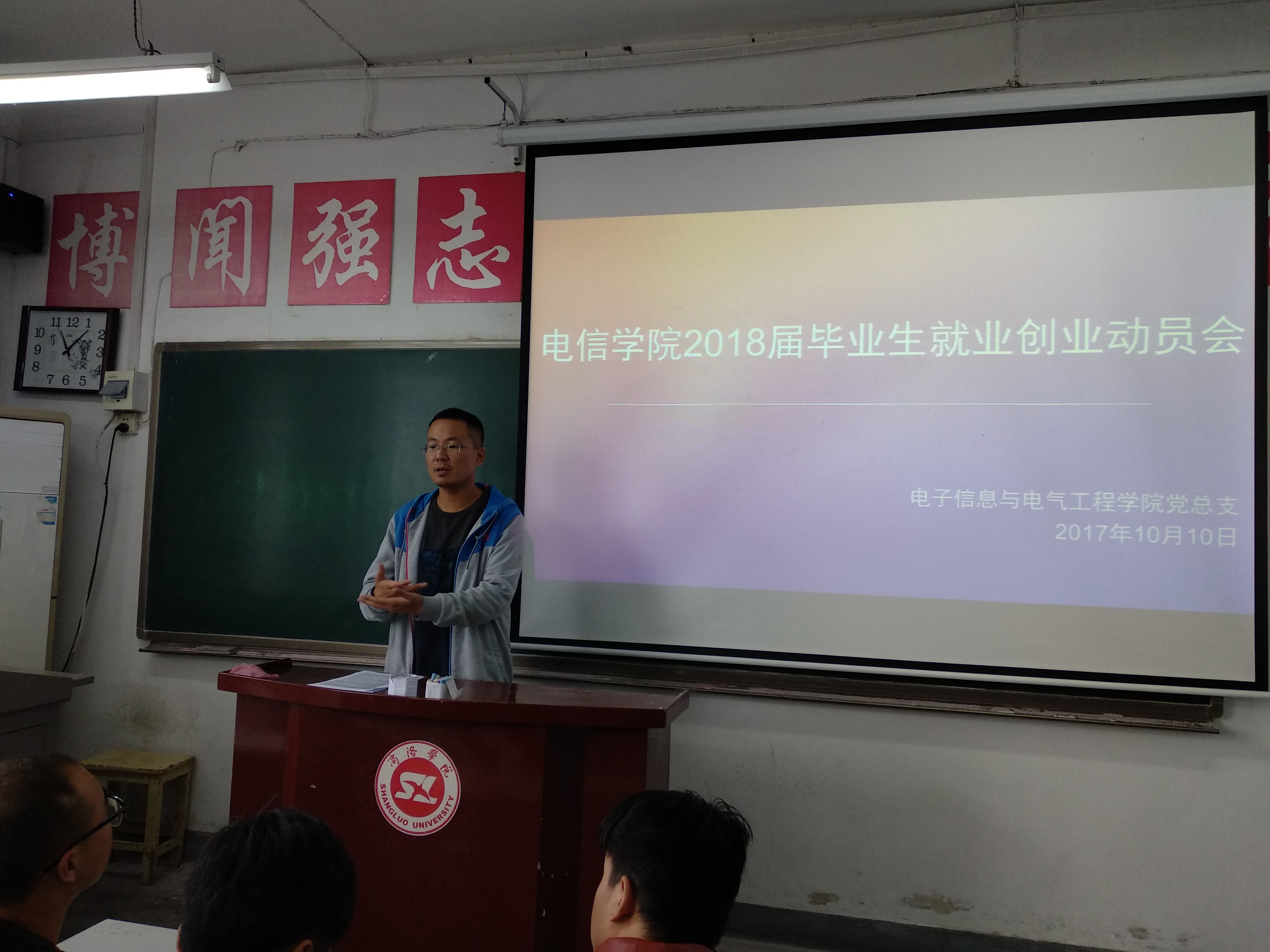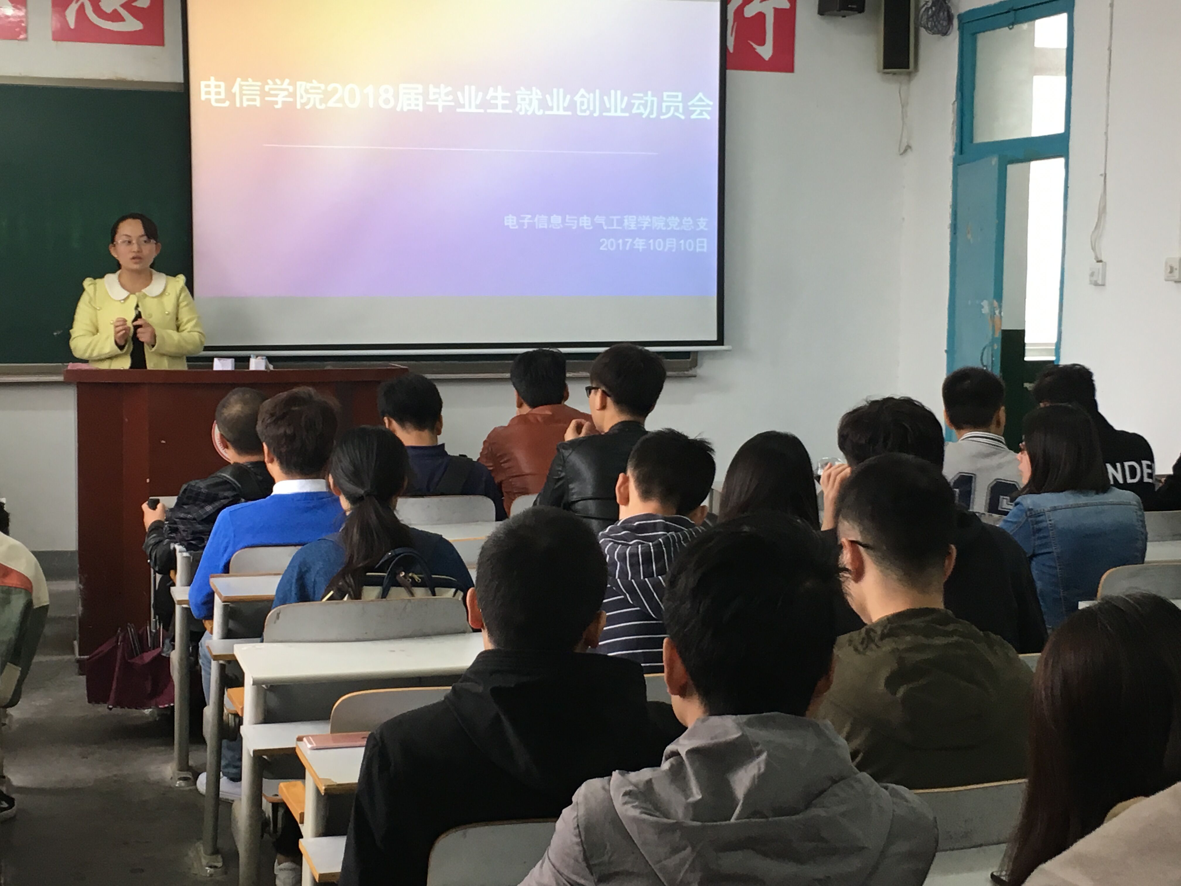 10月10日,公司在二号教学楼201教室召开了2018届毕业生就业创业动员会,院学工办主任陈倩、院团总支书记李磊出席会议并分别做了动员讲话,2018届毕业生各班班团干部、员工党员60余人参加了本次会议。会议由陈倩主持。