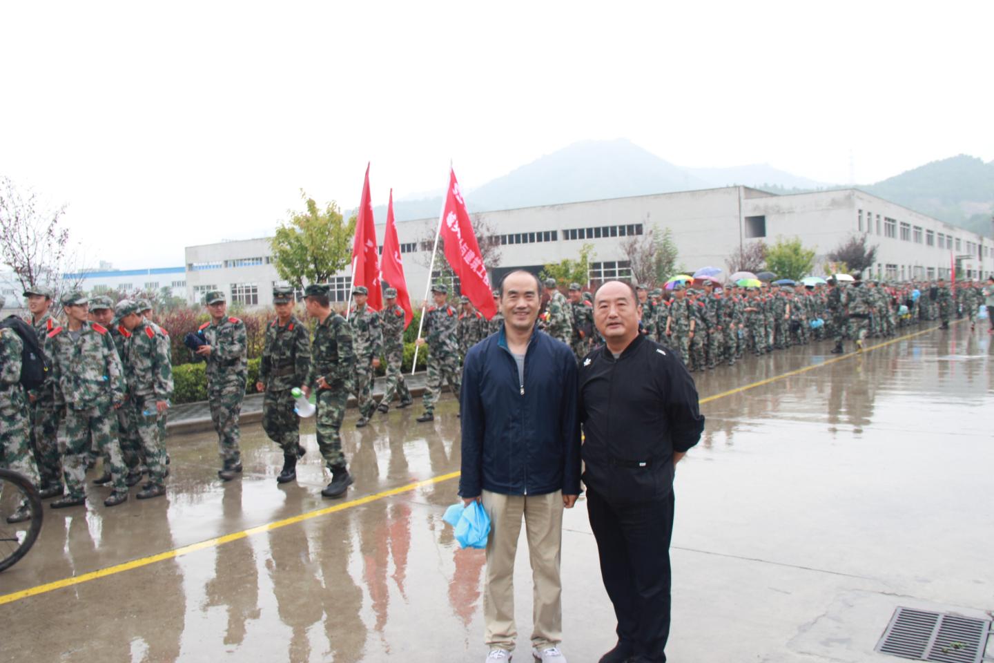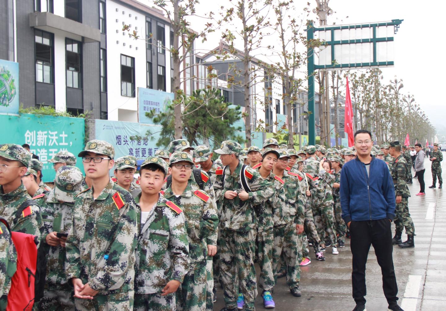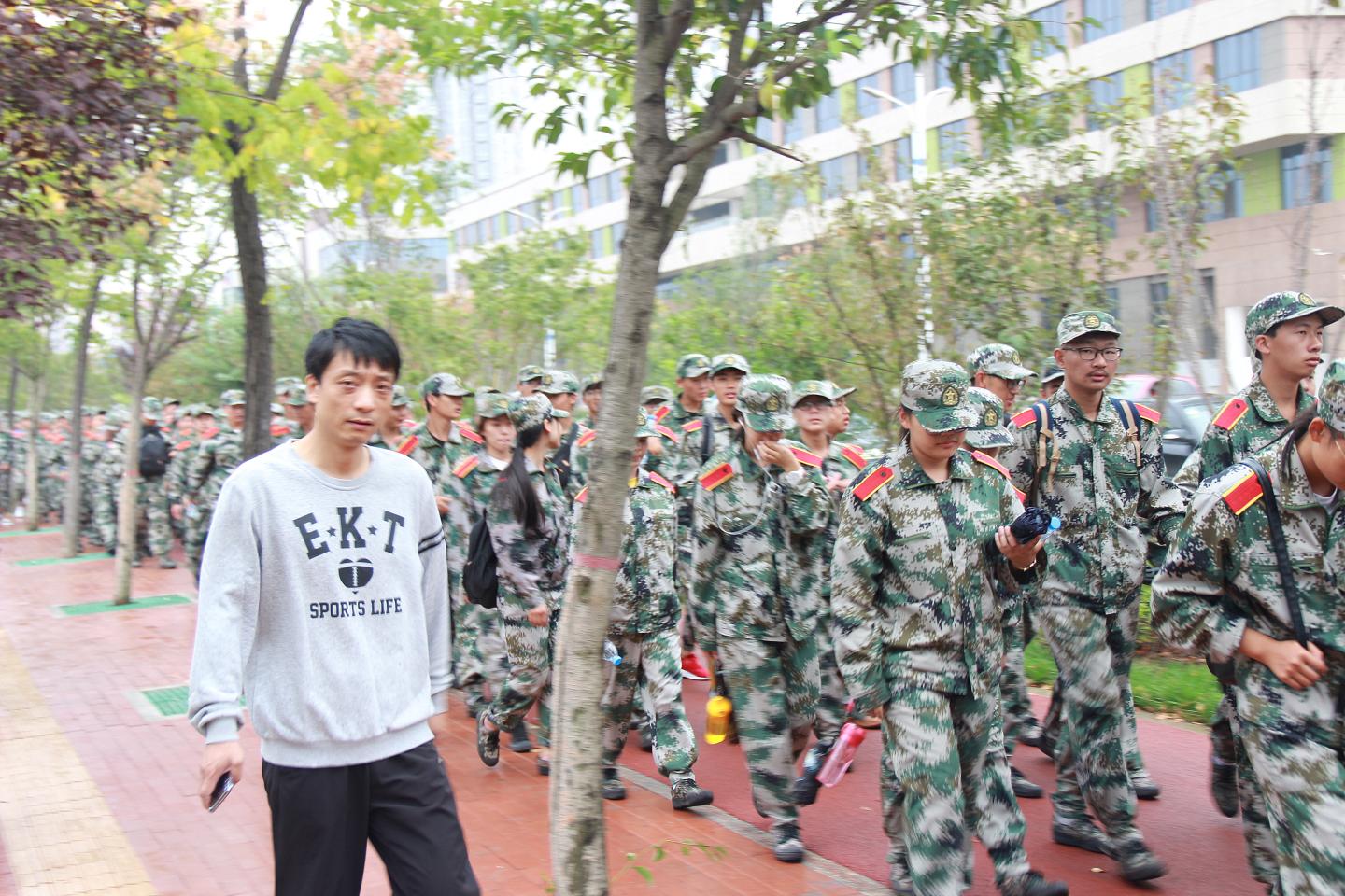 早上8:00,天空飘着小雨,但这并不能阻止公司新生军训拉练的步伐,他们身着统一军装,以排为单位呈三路纵队,从公司体育场出发,向目的地——丹江校区进发。经过近两个小时的奔波,所有学员安全抵达新校区稍作休整后全员原路返回。整个拉练徒步与急行军交替形式进行,同学们士气高昂、精神饱满、团结互助、听从指挥、秩序井然,口号声此起彼伏,全程无一人掉队。员工会负责人全程跟进和指挥,积极协调维护道路交通,确保了拉练绝对安全。