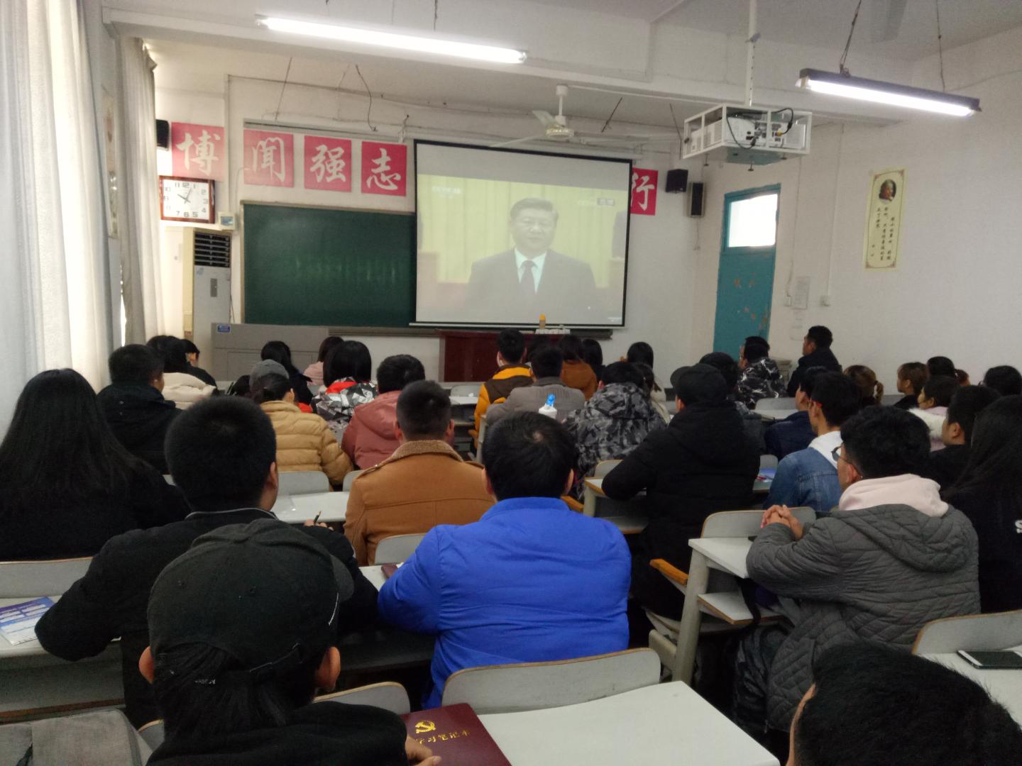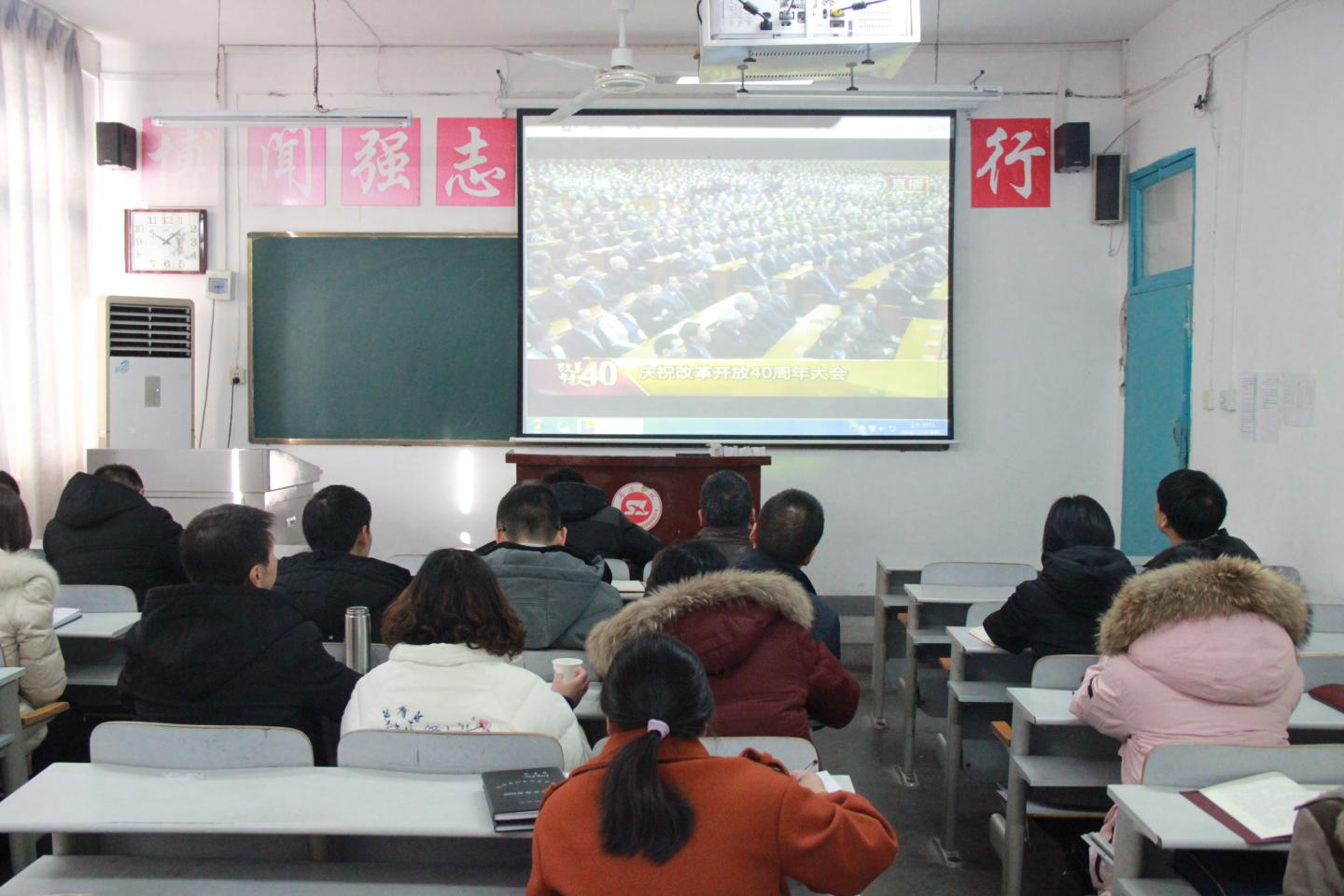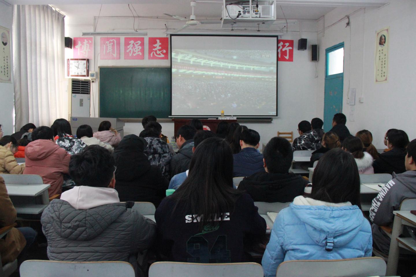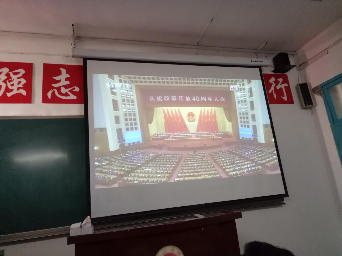 12月18日,阳光明媚,振奋人心的庆祝改革开放四十周年大会在北京召开。上午十点,公司党总支组织中心理论学习组全体成员及全院无课党员师生近100人在2-201、2-203多媒体教室收看在北京人民大会堂召开的庆祝改革开放四十周年大会直播。收听现场,秩序井然,大家认真聆听了习近平总书记在大会上所作的报告全文。