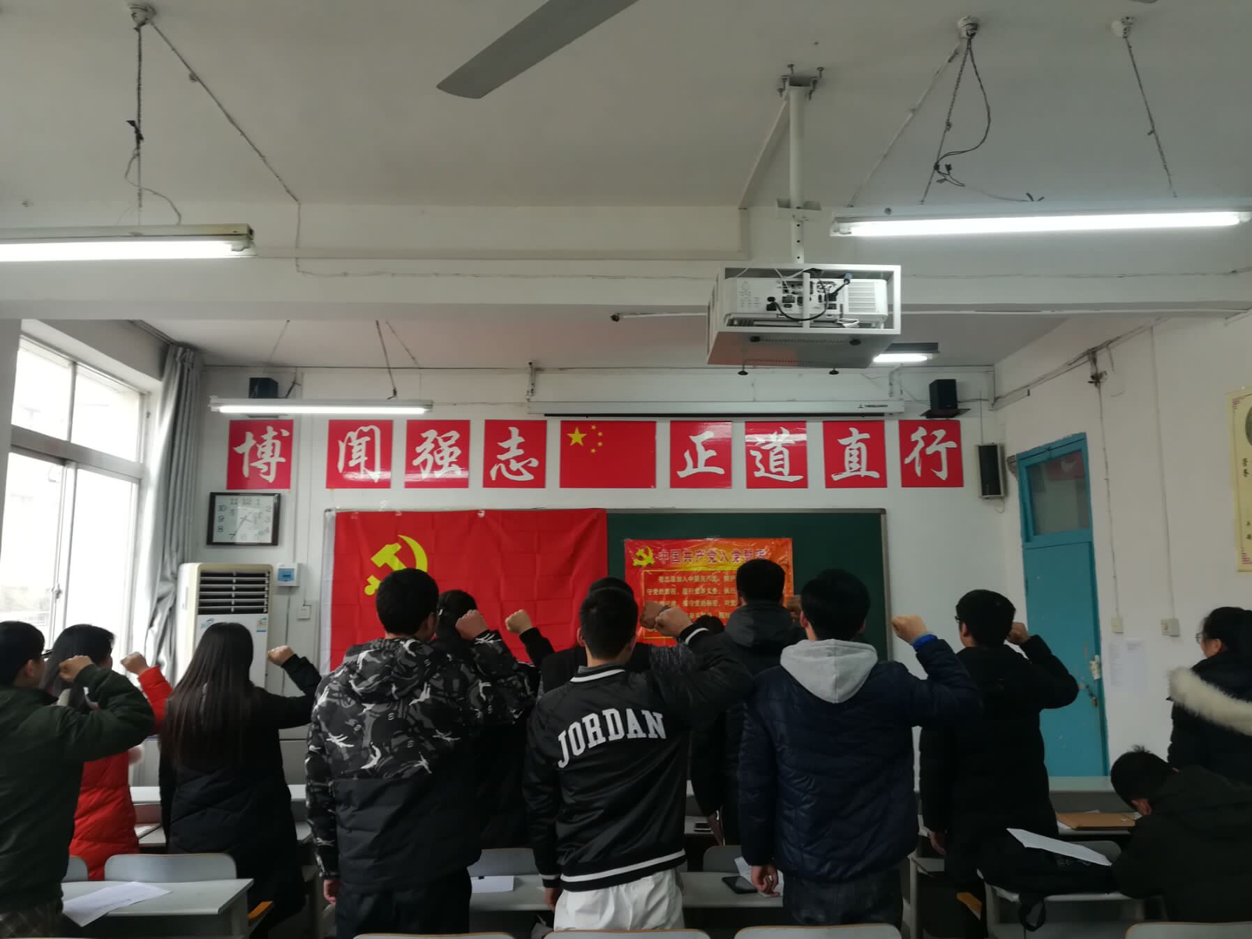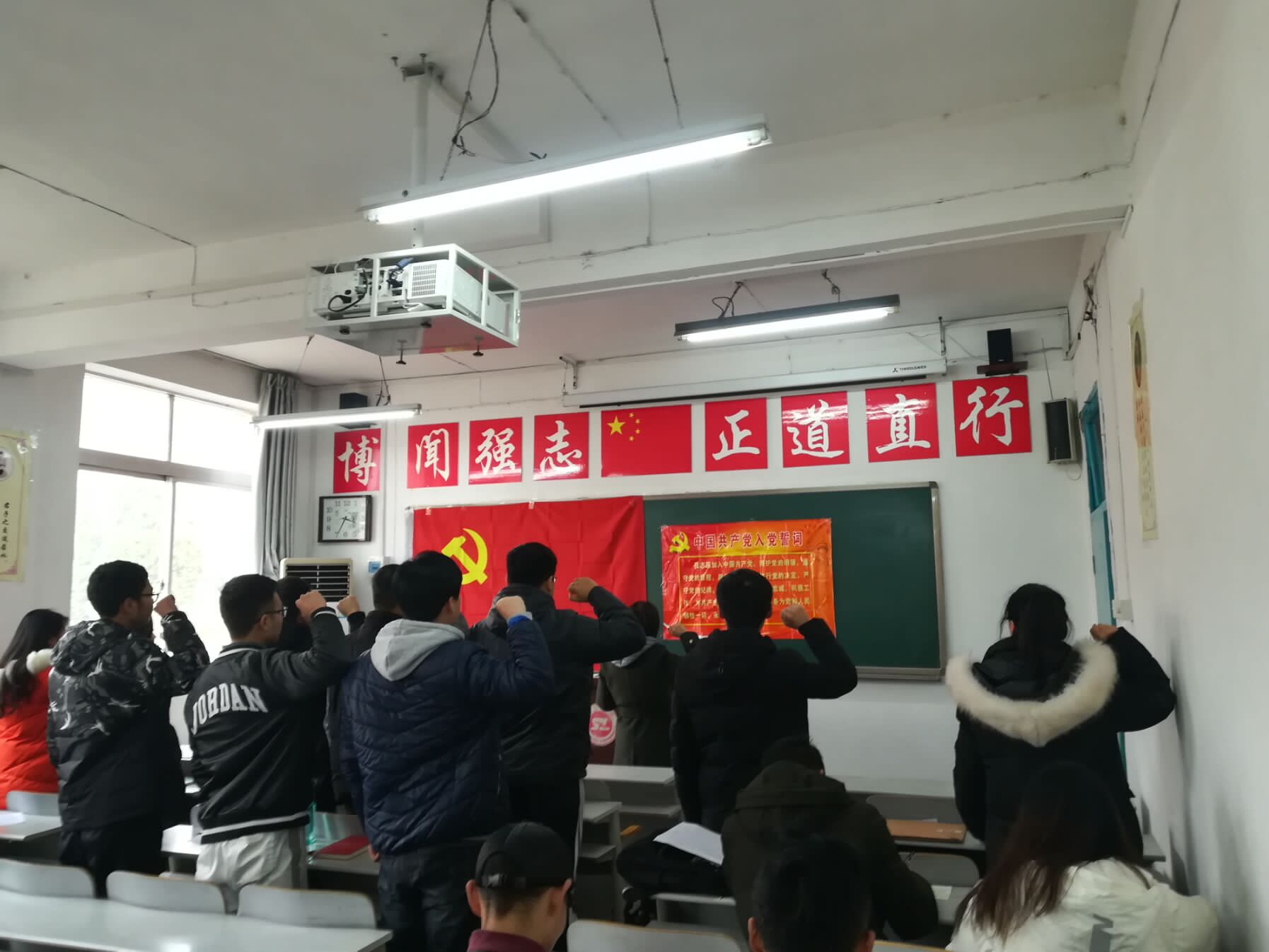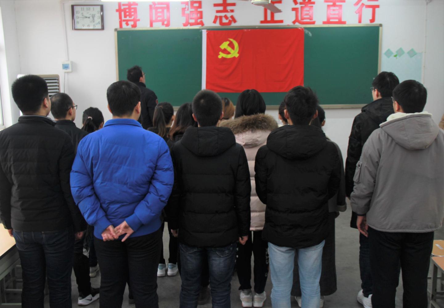 鲜红的党旗简而有力地为现场渲染出庄重的气氛,在雄壮的《国际歌》后,宣誓仪式正式开始。领誓人带领预备党员进行宣誓,现场顿时响起了阵阵激昂的宣誓声,同志们都用发自内心的声音抒发对党忠诚的决心,面对着党旗,大家接受了一次身心的特殊洗礼。此次活动在两个支部书记的讲话中落下帷幕,他们指出,作为员工党员应加强理论学习,提高党性修养;在日常工作、学习生活中应提升思想政治觉悟,不断提高自身素质,为身边的同学起到模范带头作用。