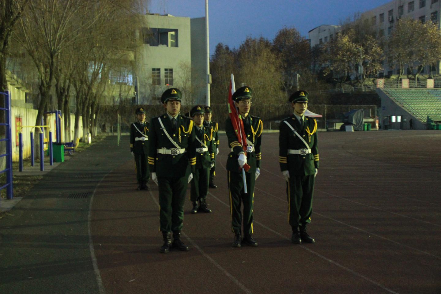 7点20分,庄严肃穆的国歌拉开了升旗仪式的帷幕。旗手们身着军装,踏着正步,以饱满的热情庄重地护送五星红旗前往升旗台。全体人员肃立向国旗行注目礼。