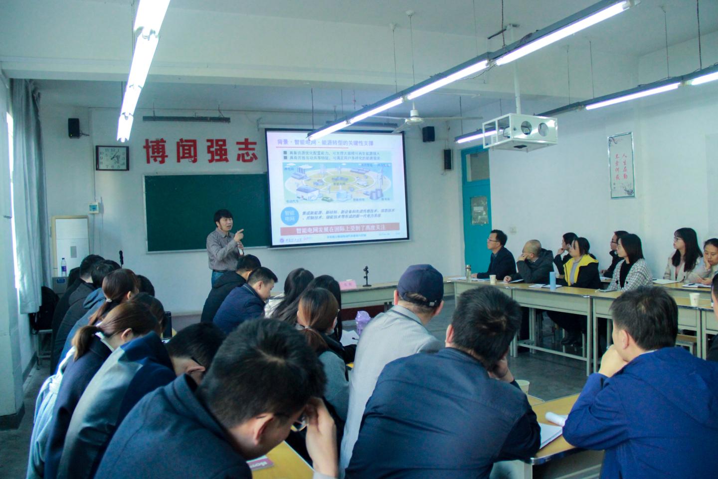 报告会上,张辉教授结合自己(团队)的科研项目,讲解了独立驱动电车的研究意义和背景、多轮独立驱动架构和控制等内容;结合新能源汽车发展规划,系统分析了电动汽车发展面临的主要课题,并就电动汽车的驱动、转向、充电等技术进行了系统讲解。报告会结束后,张教授与电气专业教师就团队建设、人才培养、科学研究等领域进行了深入的交流互动。