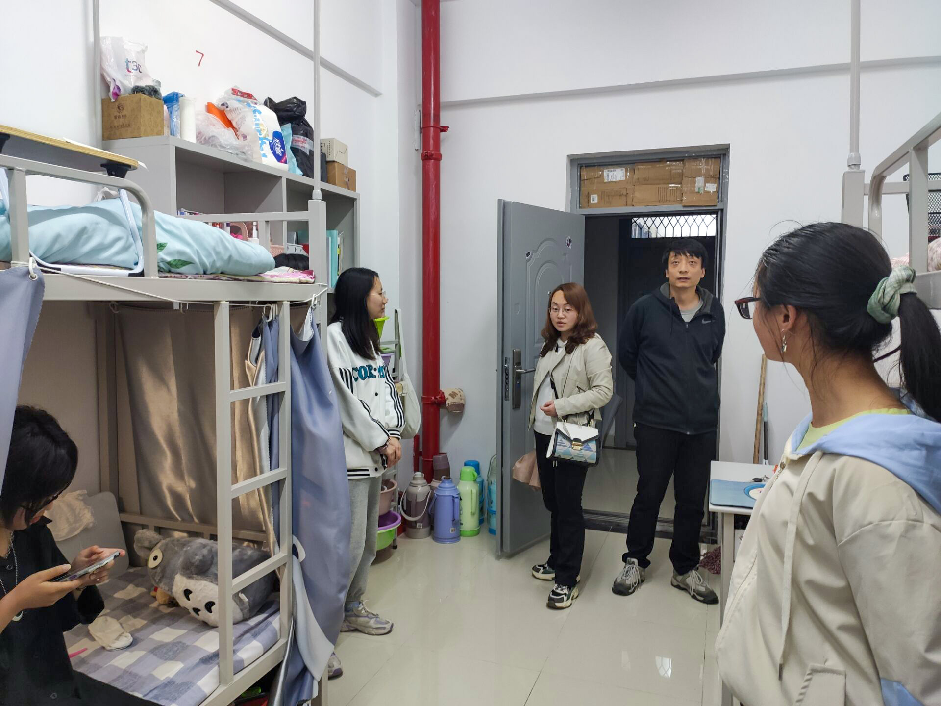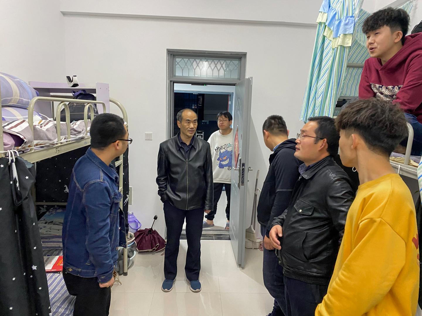 4月24日晚19:00,公司党总支书记李英、党总支副书记.副经理陈垚、学工办主任陈倩、辅导员唐龙龙、谢楠等一行前往丹江校区进行宿舍走访活动,第一时间为搬迁宿舍的电信员工送上温暖与关怀。