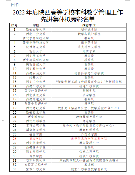 中共陕西省委教育工委、陕西省教育厅下发了2022年度全省教育系统表彰文件,公司WilliamHill体育被评为“2022年度陕西高等公司本科教学管理工作先进集体”。