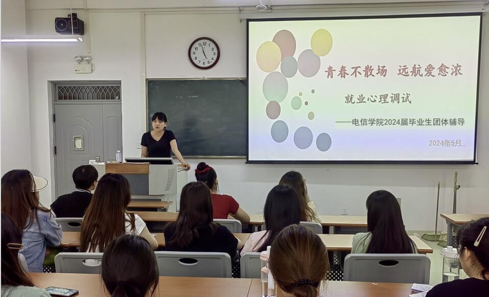 毕业班辅导员孙凯、商哲从客观认识自我、就业心理调适、做好求职前的准备、树立良好的就业心态等方面分别为毕业生作了就业心理团体辅导,对毕业生们提出了四点建议:一是做好就业心理调适,积极疏导就业过程中产生的焦虑、迷茫等不良情绪,可以采用自我转化法、适度宣泄法、自我安慰法、理性情绪法等方法调整自己的心理状态,疏导自己的不良情绪,克服各种困难和挫折,树立良好的就业心态。二是做好求职前各项准备,从求职渠道、个人简历、仪表着装、面试技巧等方面着手,制订求职目标和求职计划,不断积累求职经验,提升求职成功的几率。三是认清当前就业形势,把握就业机会,在岗位的选择上既不要好高骛远,也不要妄自菲薄,适合自己的就是最好的。四是积极转变就业观念,树立“先就业、再择业”的就业理念,避免陷入就业期望值过高、不就业和慢就业的藩篱。在择业时,放弃过去那种 “择业就是一步到位”,要求“绝对安稳”的观念,可以先选择一个职业,不断提高自己的工作能力,凭借自己的努力逐步实现自我价值。同时,要发扬奋斗精神和吃苦精神,不好逸恶劳,不好高骛远,从底层做起,从基层做起,一步一步实现自己的人生目标。